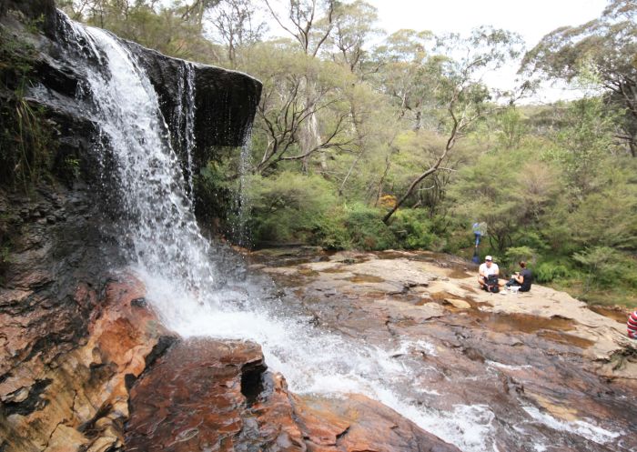 Bushwalkers enjoying Weeping Rock Wentworth Falls, Blue Mountains National Park