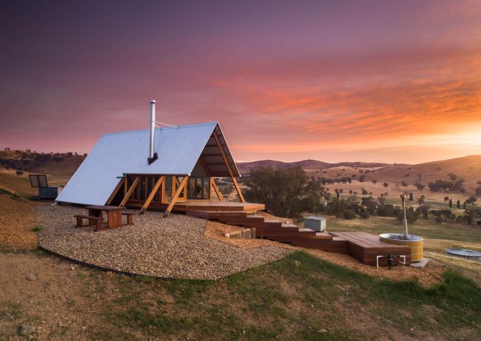 If you’re after a touch of luxe, Kimo’s Estate’s off-grid huts tick all the boxes: an outdoor hot tub, a gourmet produce basket for breakfast and a hot shower with stunning views across the Murrumbidgee River Flats. Architecturally designed, the hut is completely off-grid and located on top of a hill in splendid isolation, with a deck out the front to spend evenings looking up at an unfiltered view of the night sky. Explore nearby Gundagai while you are there, with bushwalking, historic architecture and fascinating Indigenous history to discover.