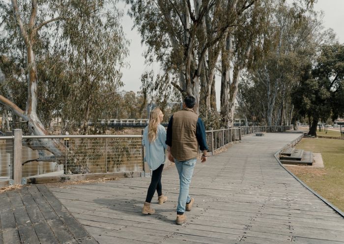 Stroll through towering riverside red gums and statues depicting pioneers and native animals on the Koondrook Barham Redgum Statue River Walk. You can also explore the historic Murray River on the Barham Boardwalk, an accessible decking built from dismantled river bridge timber.