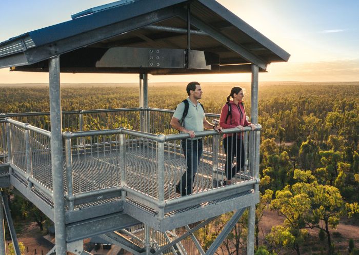 Couple looking at the view from Pilliga Forest Lookout Tower, Pilliga