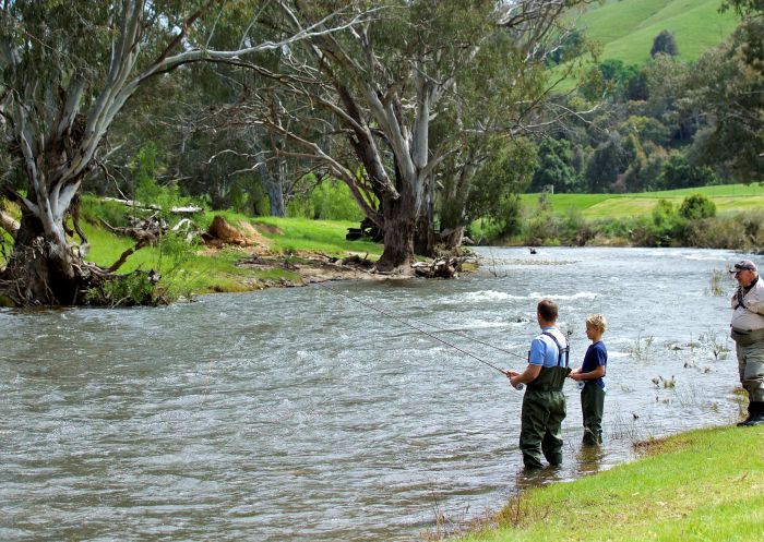 Father and son enjoying a fly fishing lessons on the Goobarragandra River -Tumut - Snowy Mountains