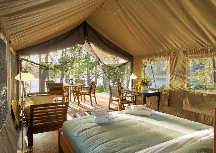 Inside the safari tent at Tanja Lagoon Camp in Bermagui, Sapphire Coast, South Coast
